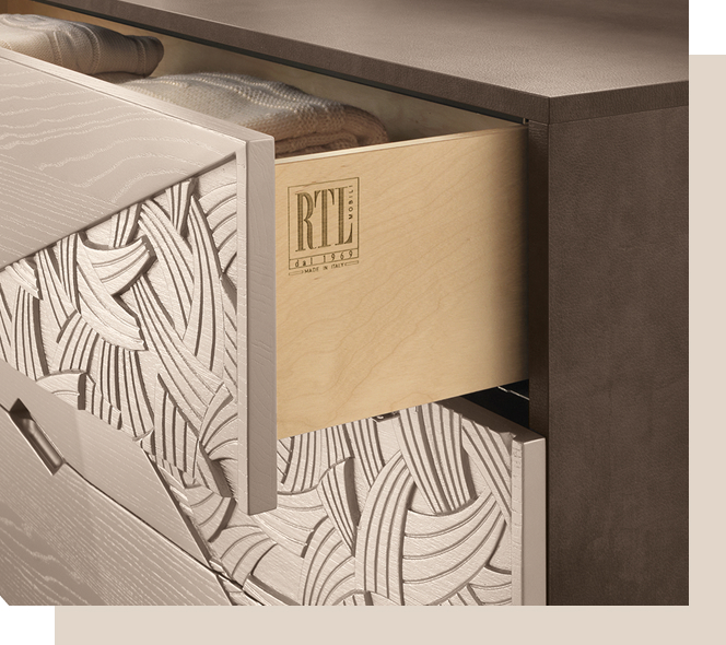 Finiture, textures e materiali sono ciò che fa la differenza. RTL Mobili propone soluzioni d’arredo composte da materiali pregiati, con un’attenzione particolare all’impatto ambientale e con la volontà di garantire ai clienti prodotti di alta qualità. Strutture in tamburato ed elementi curvi in multistrato compongono così i nostri prodotti, per una performance impeccabile che dura nel tempo.