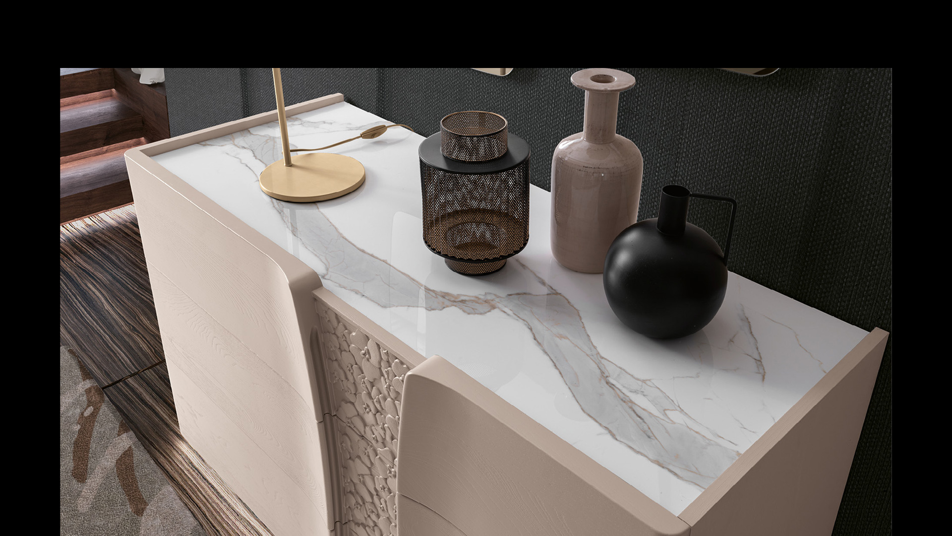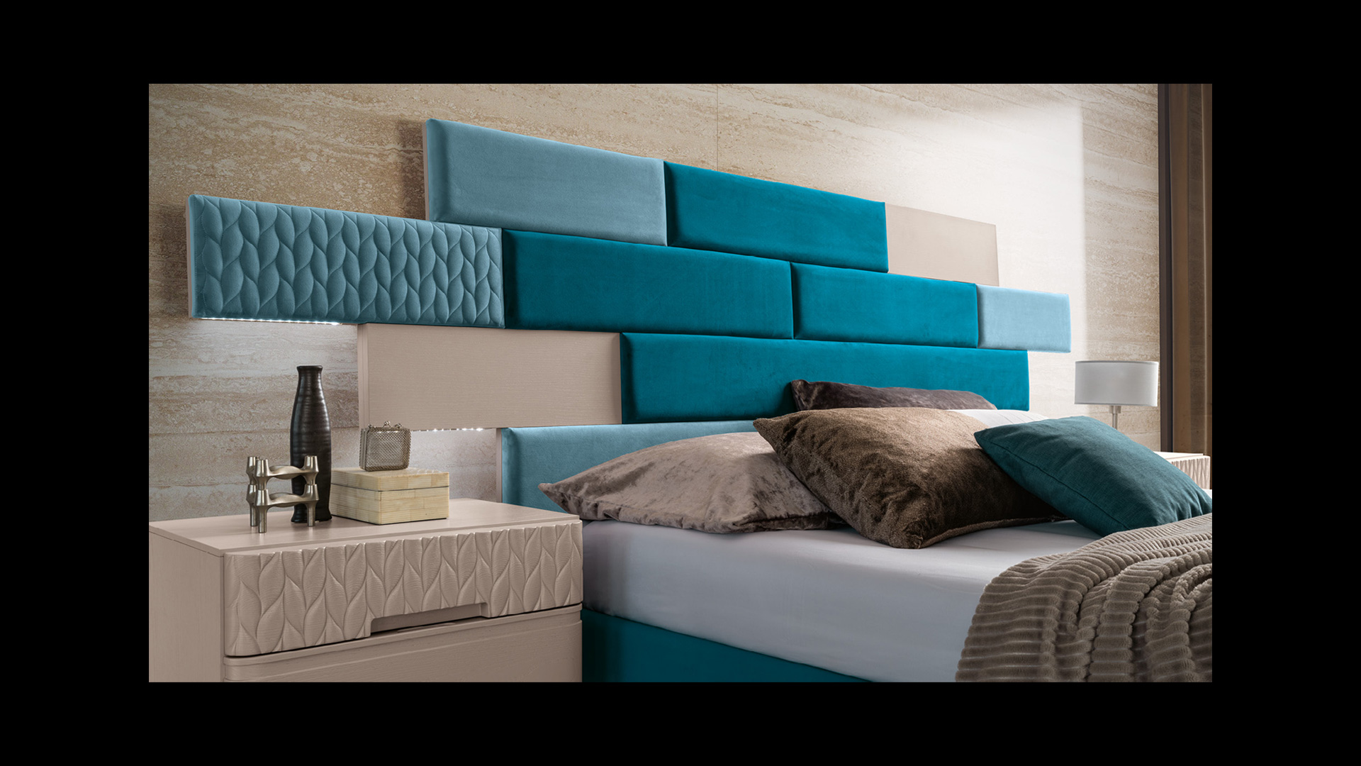 Il motivo decorativo della camera River, presente nei comodini e nel comò crea un vortice curvilineo in completa armonia con le impunture delle testate dei due letti: il letto RIVER, con la sua testata sagomata con pannello imbottito centrale, ed il letto MOON, che presenta una testata più alta (H. 150) completamente imbottita.