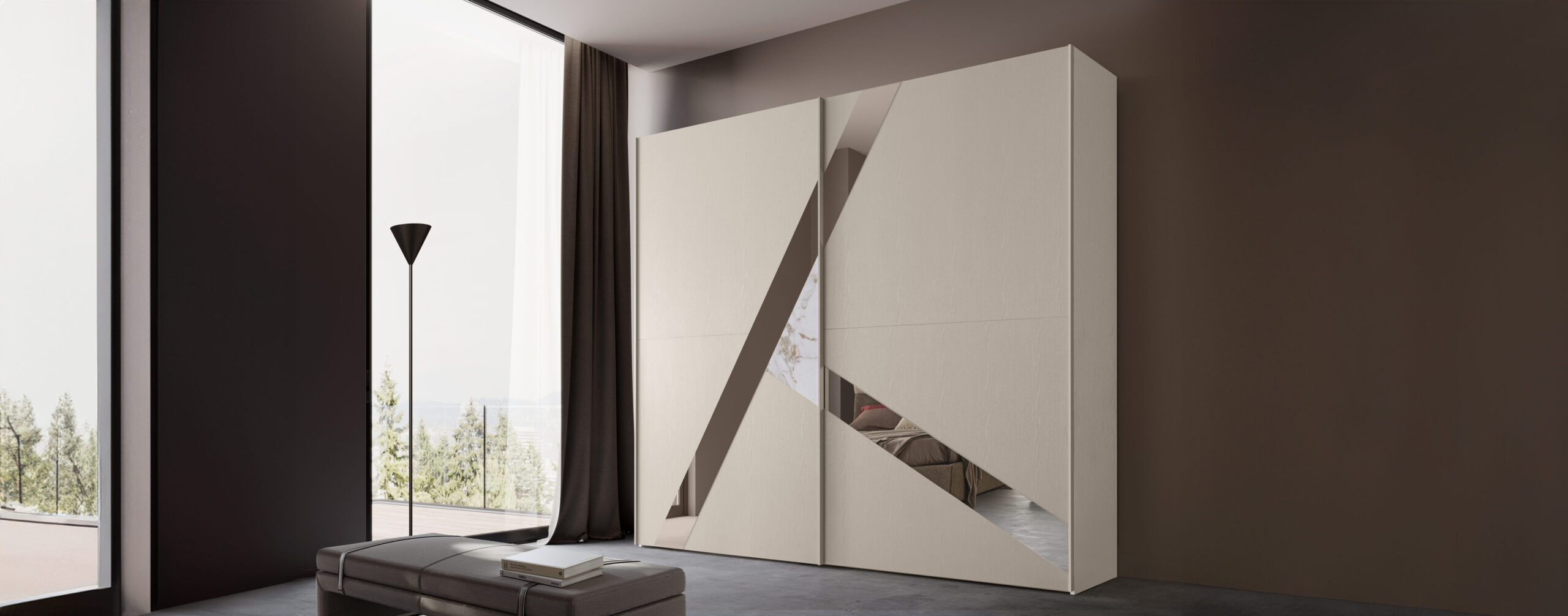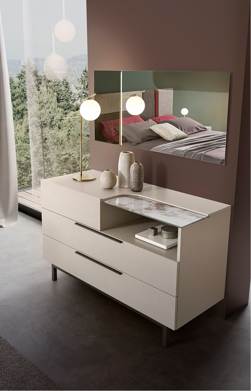 L’armadio Giglio a due ante scorrevoli è proposto unicamente nella finitura cachemire, un beige caldo dalla texture materica. Il segno diagonale che attraversa i frontali integra inserti in specchio e vetro serigrafato Onice o Calacatta, disegnando un motivo grafico che moltiplica la luce e alleggerisce i volumi. I profili sottili mantengono l’estetica pulita, mentre lo scorrimento è fluido e silenzioso. Gli interni sono configurabili con ripiani, tubi, cassetti ed eventuale illuminazione a LED per un’organizzazione impeccabile. Un guardaroba contemporaneo che completa con eleganza la linea Giglio.