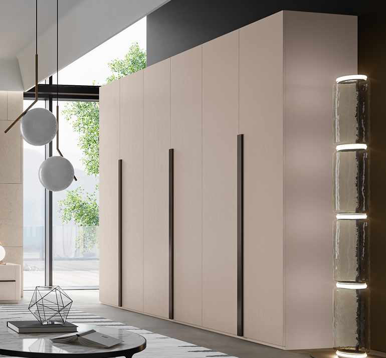 ORIZZONTE è l’armadio modulare che coniuga ordine e stile in ogni dettaglio. Disponibile con ante battenti o scorrevoli, adotta chiusure e guide ammortizzate per un’apertura fluida e silenziosa. La struttura componibile permette di organizzare lo spazio in modo intelligente con ripiani, tubi appendiabiti e cassettiera su misura. L’anta con specchio integra un segno distintivo: bronzo nella versione cachemire, chiaro nella variante bianca, per ampliare visivamente l’ambiente e donare profondità alla stanza.