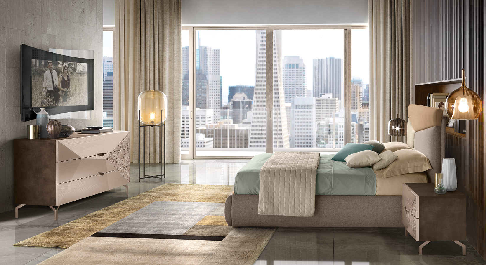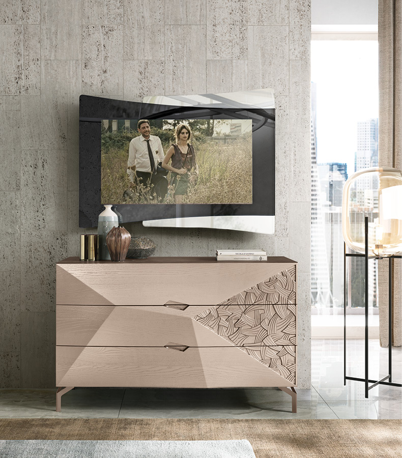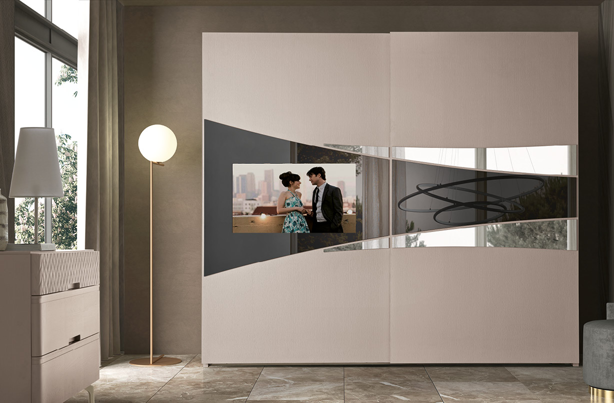 L’alloggio della TV è collocato nella parte retrostante della specchiera, così da renderla invisibile quando spenta; la stessa soluzione è disponibile per l’armadio CIAK. Entrambe le configurazioni accolgono TV fino a 43″, garantendo un’esperienza visiva confortevole e una perfetta integrazione con l’ambiente notte. Ne risulta un sistema pratico e raffinato: tecnologia integrata, ordine visivo e massima valorizzazione della luce e dei riflessi, per una camera sempre curata e contemporanea.
