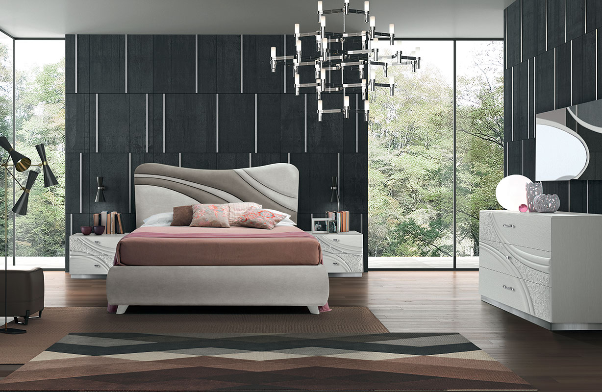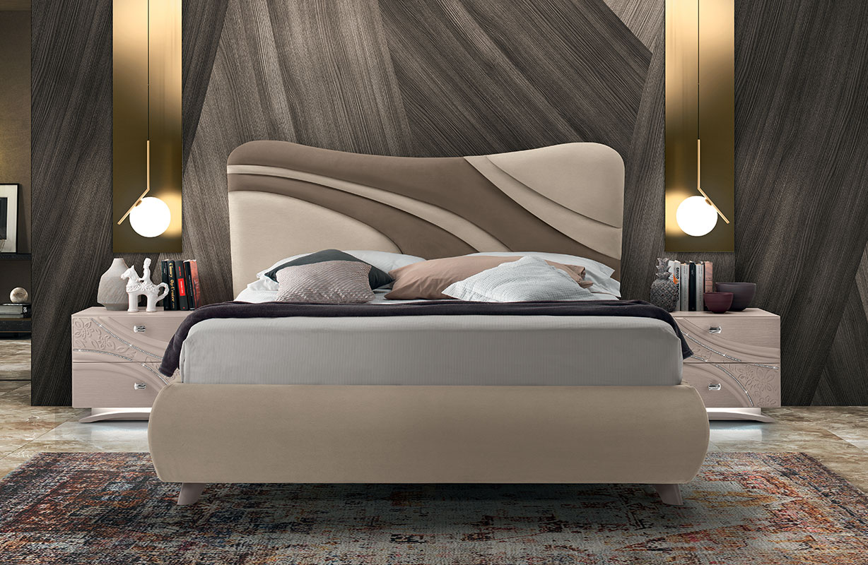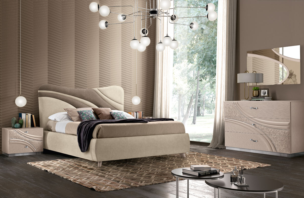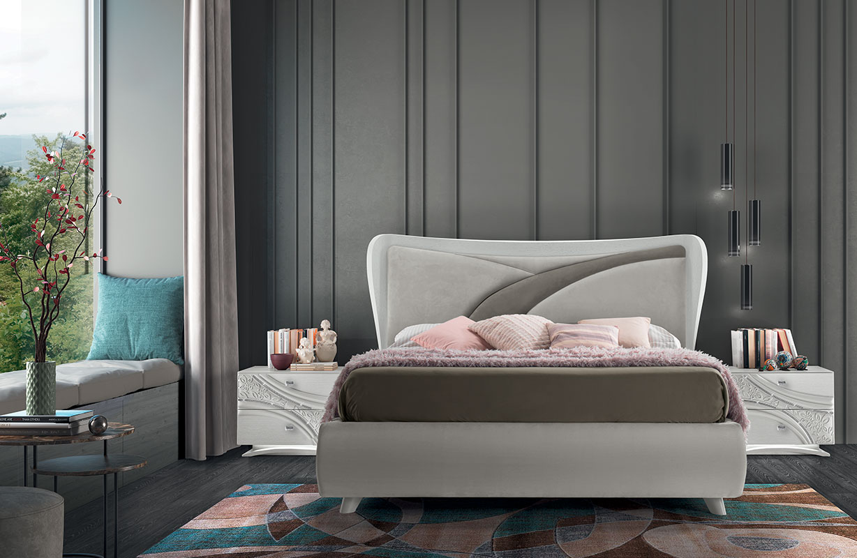 Il motivo decorativo, segno identitario della collezione, attraversa frontali e testiere con traiettorie curve e inserti a rilievo: un disegno dinamico che anima le superfici e valorizza l’insieme. Nei gruppi notte (comò, comodini, settimino) il decoro centrale è enfatizzato da una sottile bordatura di strass; la base può essere diritta con plinto cromo oppure curva con luce LED attivata da sensore di movimento, per un tocco scenografico e funzionale. La proposta letti comprende il modello imbottito COCÒ e il modello LIZ con testiera in frassino poro aperto Bianco e imbottitura soft; per esigenze di capienza sono disponibili versioni con contenitore a uno o due movimenti. Rivestimenti in ecopelle o nabuk e specchiere coordinate (bicolore, chiari/bronzo o chiari/fumé a seconda della finitura) completano la composizione.