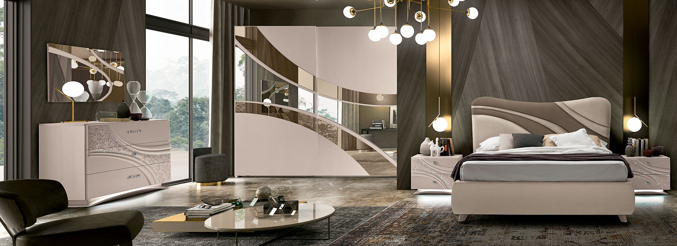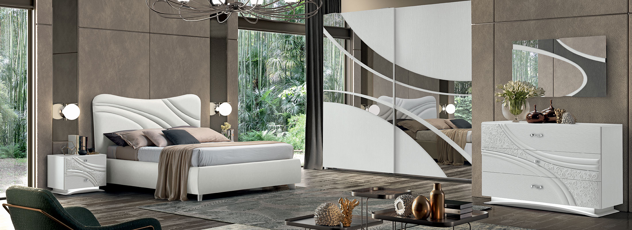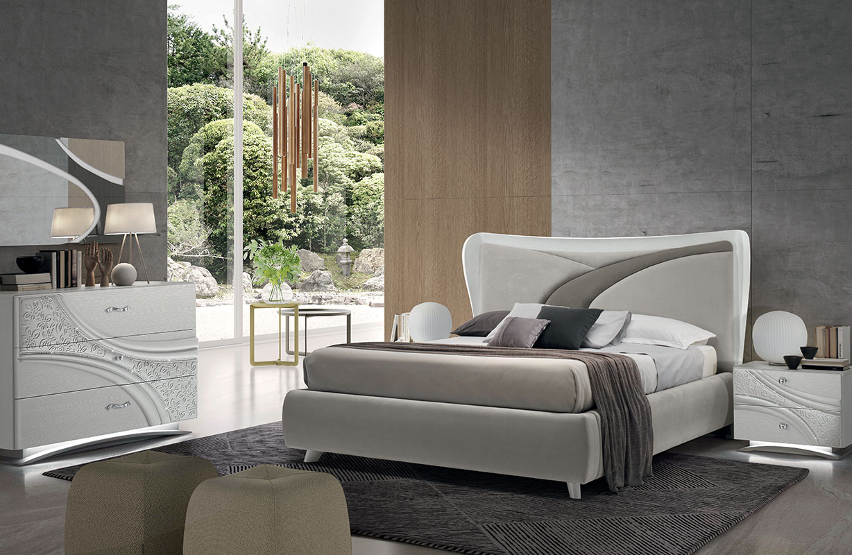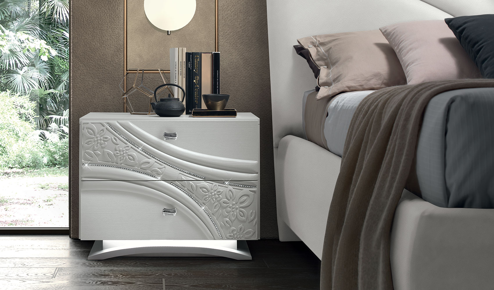 Il motivo decorativo, segno identitario della collezione, attraversa frontali e testiere con traiettorie curve e inserti a rilievo: un disegno dinamico che anima le superfici e valorizza l’insieme. Nei gruppi notte (comò, comodini, settimino) il decoro centrale è enfatizzato da una sottile bordatura di strass; la base può essere diritta con plinto cromo oppure curva con luce LED attivata da sensore di movimento, per un tocco scenografico e funzionale. La proposta letti comprende il modello imbottito COCÒ e il modello LIZ con testiera in frassino poro aperto Bianco e imbottitura soft; per esigenze di capienza sono disponibili versioni con contenitore a uno o due movimenti. Rivestimenti in ecopelle o nabuk e specchiere coordinate (bicolore, chiari/bronzo o chiari/fumé a seconda della finitura) completano la composizione.