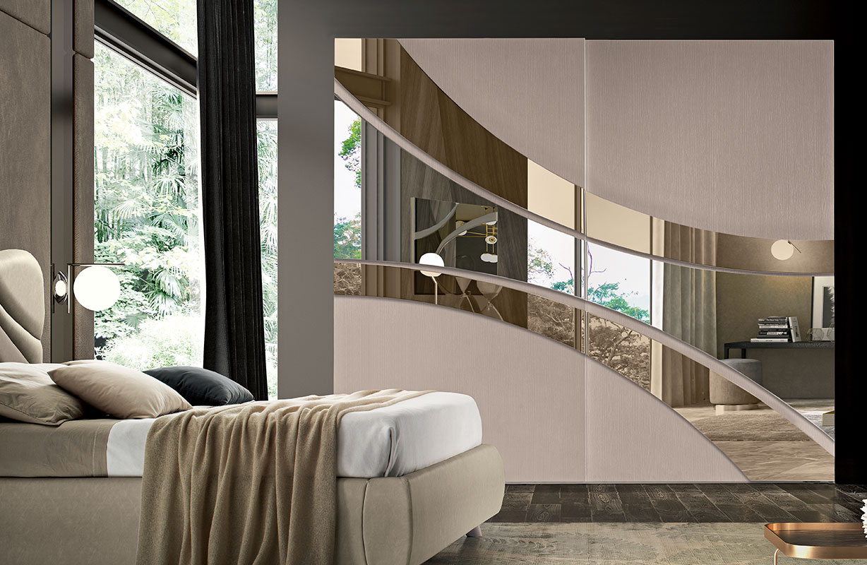 L’armadio scorrevole, interamente costruito in tamburato con chiusure ammortizzate, adotta ante con specchi sagomati e dotazione interna completa: 2 ripiani, 3 tubi appendiabiti personalizzati “RTL” e cassettiera a 3 cassetti. Un sistema coerente, tecnico e raffinato che porta in camera l’equilibrio tra design, comfort e funzionalità.