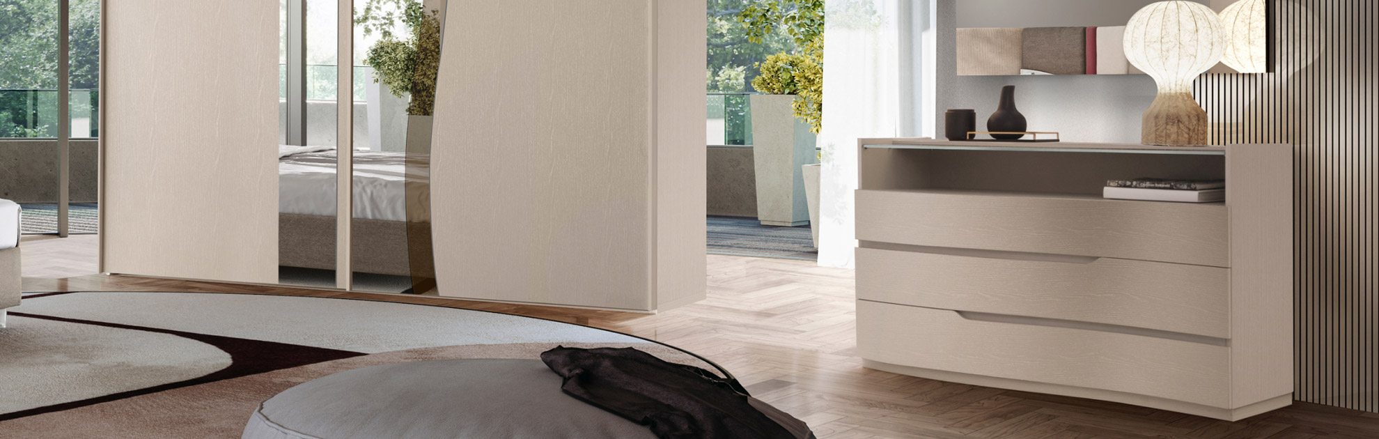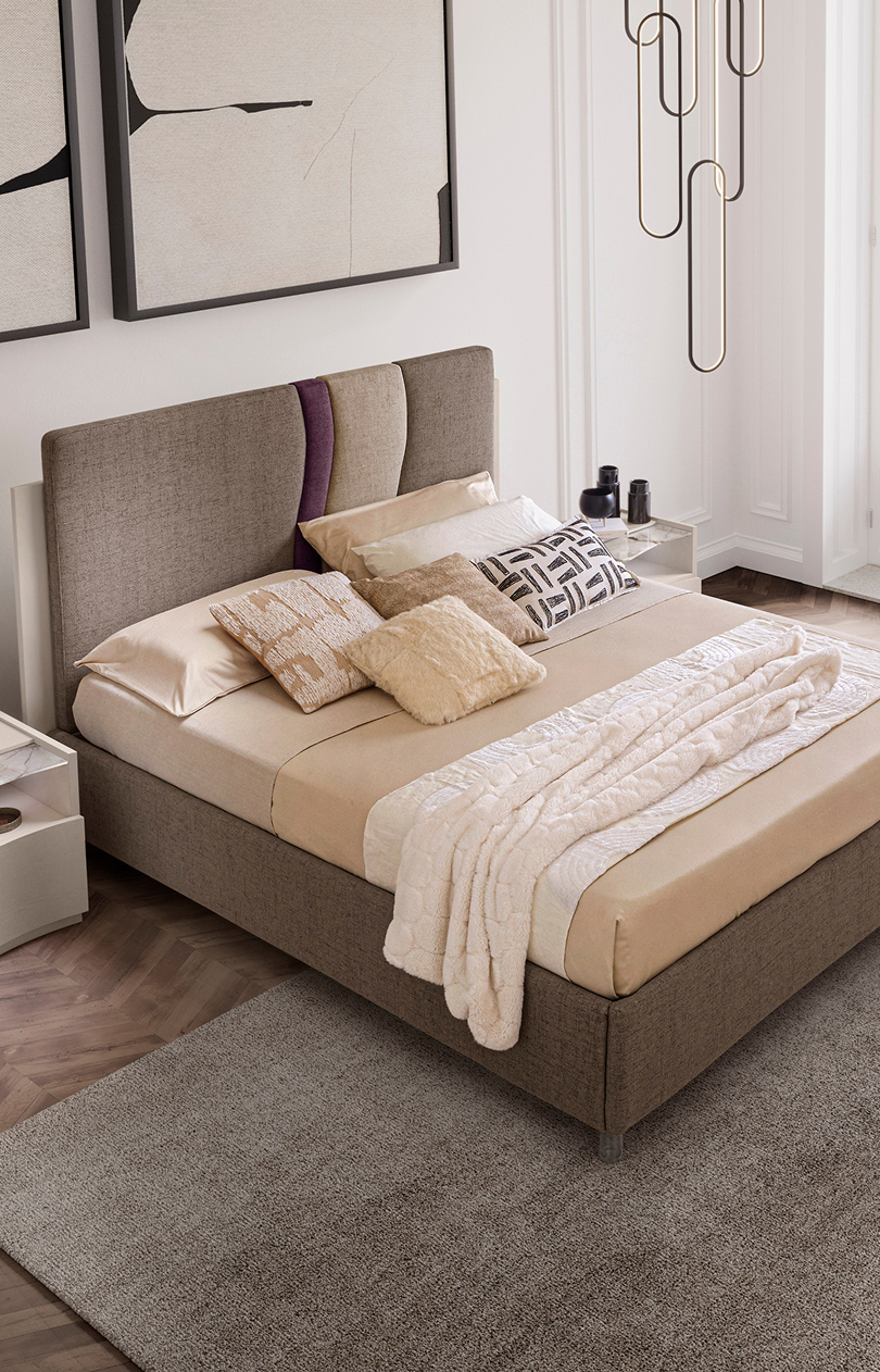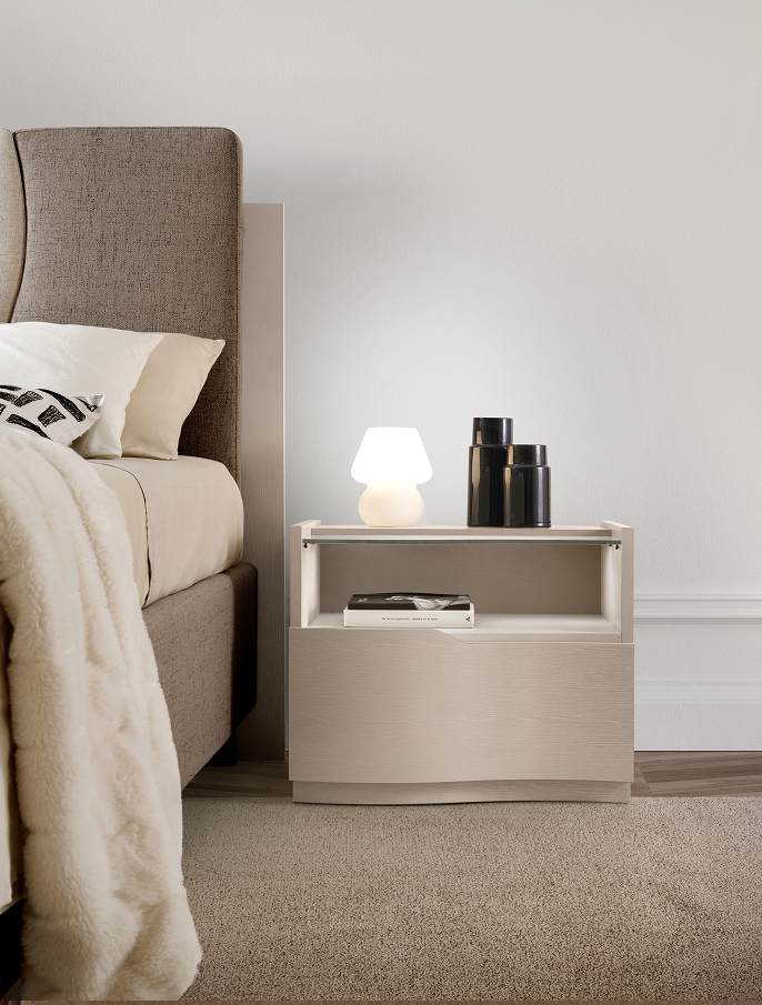Il comò e i comodini della collezione si distinguono per le forme morbide e sinuose, che evocano un naturale senso di armonia. La finitura cachemire, delicata e sofisticata, conferisce agli arredi una presenza raffinata, capace di valorizzare qualsiasi contesto abitativo.