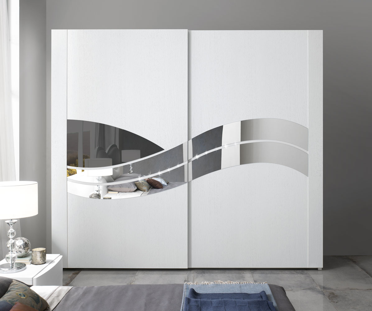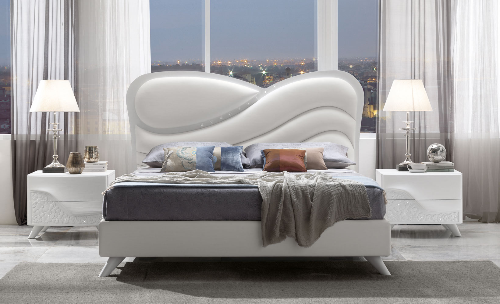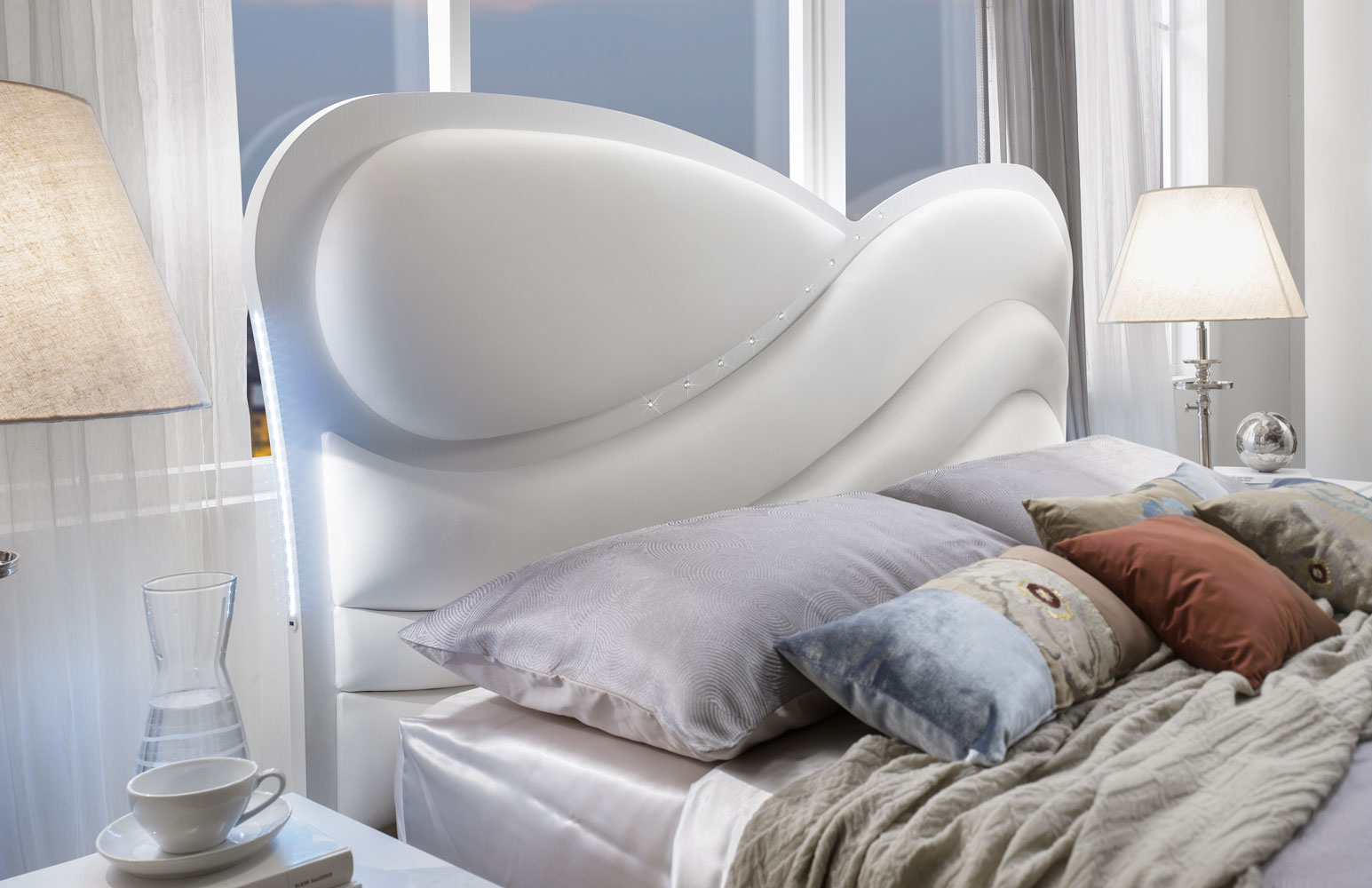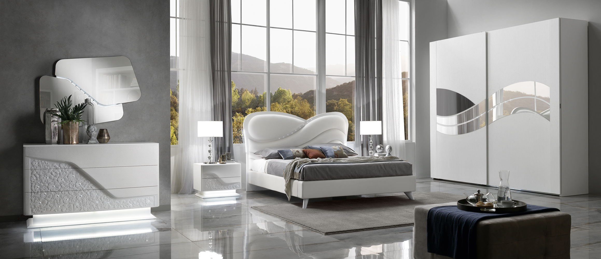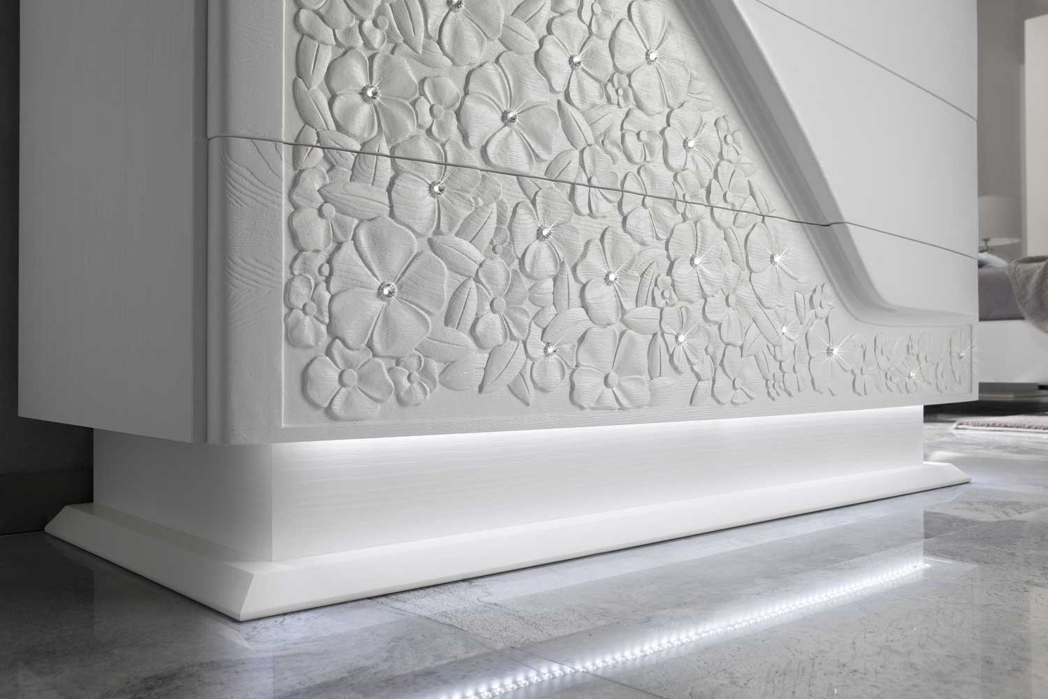 Nella configurazione total white, il letto SOGNO si distingue per la doppia imbottitura dalle linee morbide e per i LED integrati ai lati della testiera, che ne sottolineano il profilo con una luce discreta. Il gruppo notte coordinato—comò e comodini in finitura bianco poro aperto—riprende il tema decorativo con il raffinato intaglio floreale arricchito da cristalli Swarovski; a richiesta, lo zoccolo illuminato aggiunge un effetto sospeso e scenografico, mantenendo al contempo un’estetica pulita e contemporanea. L’insieme è completato dalla specchiera sagomata con luce perimetrale, che dialoga con gli specchi dell’armadio scorrevole in versione bianca, creando un gioco di riflessi capace di valorizzare lo spazio. Una proposta coerente e luminosa, che unisce matericità, comfort e dettagli di pregio.