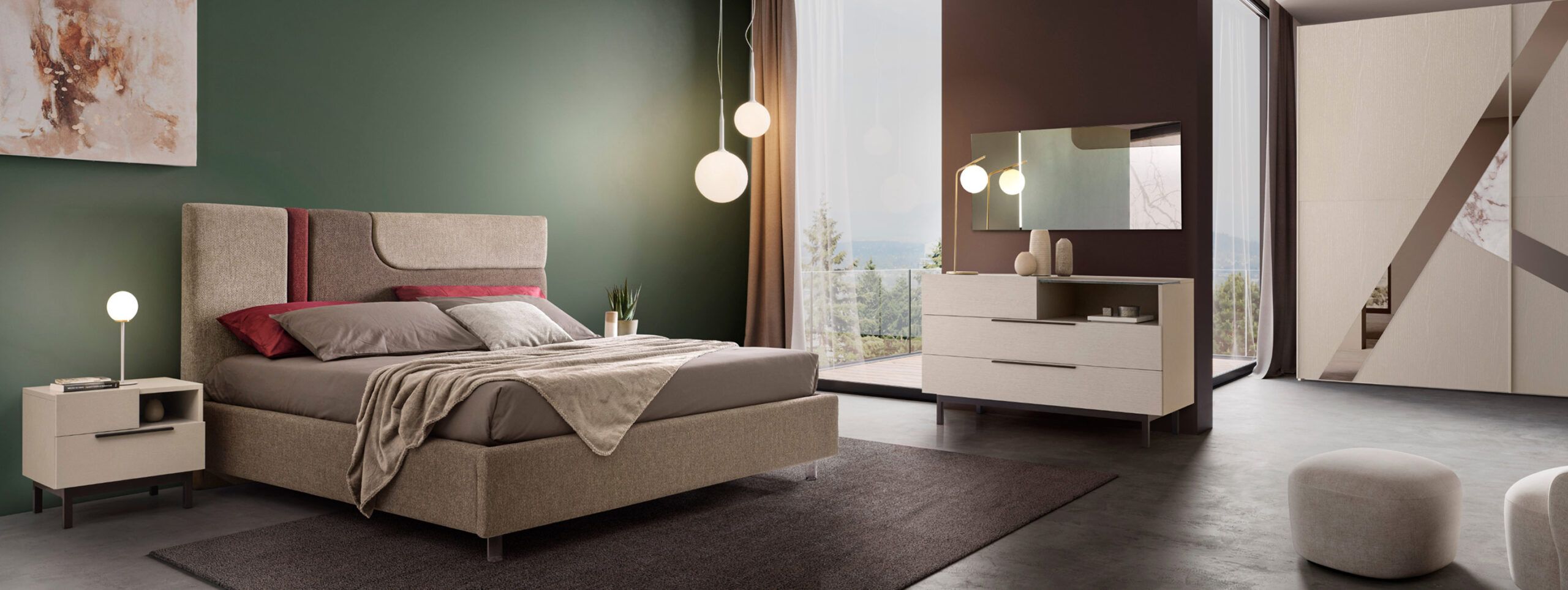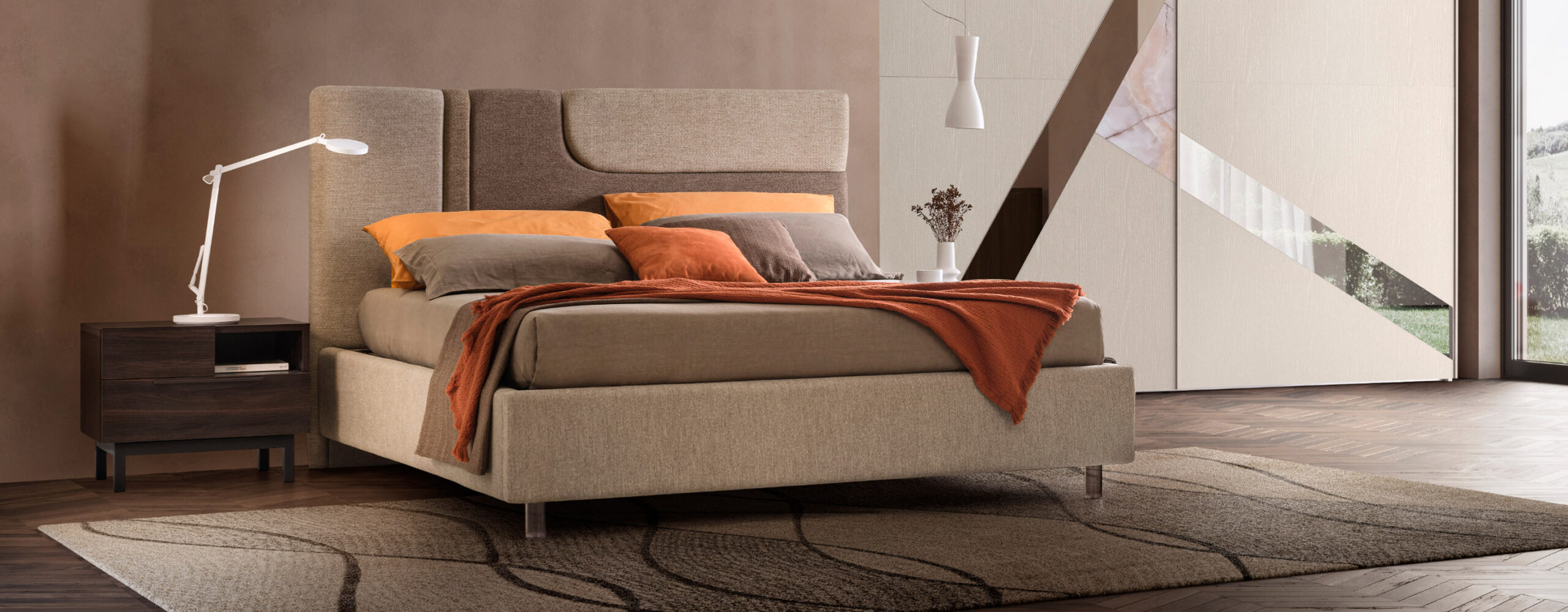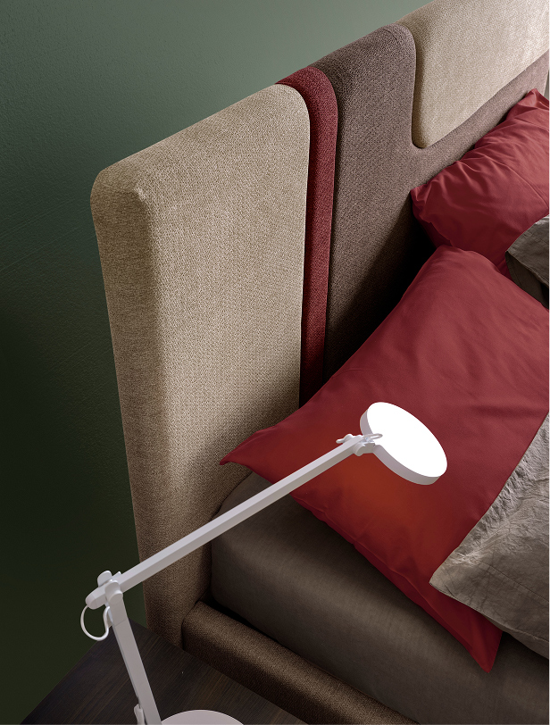 Giglio interpreta la zona notte con un linguaggio morbido e contemporaneo. La testata a pannelli imbottiti, scandita da tagli e fasce a contrasto, crea un ritmo grafico elegante e dona un appoggio confortevole alla lettura. Il giroletto snello, su piedini slanciati, alleggerisce il volume e lascia respirare lo spazio. Rivestimenti in tessuto o pelle, anche bicolore, permettono di costruire palette materiche su misura. Realizzato con struttura solida e finiture sartoriali, Giglio si inserisce con naturalezza in qualsiasi tipologia di progetto.