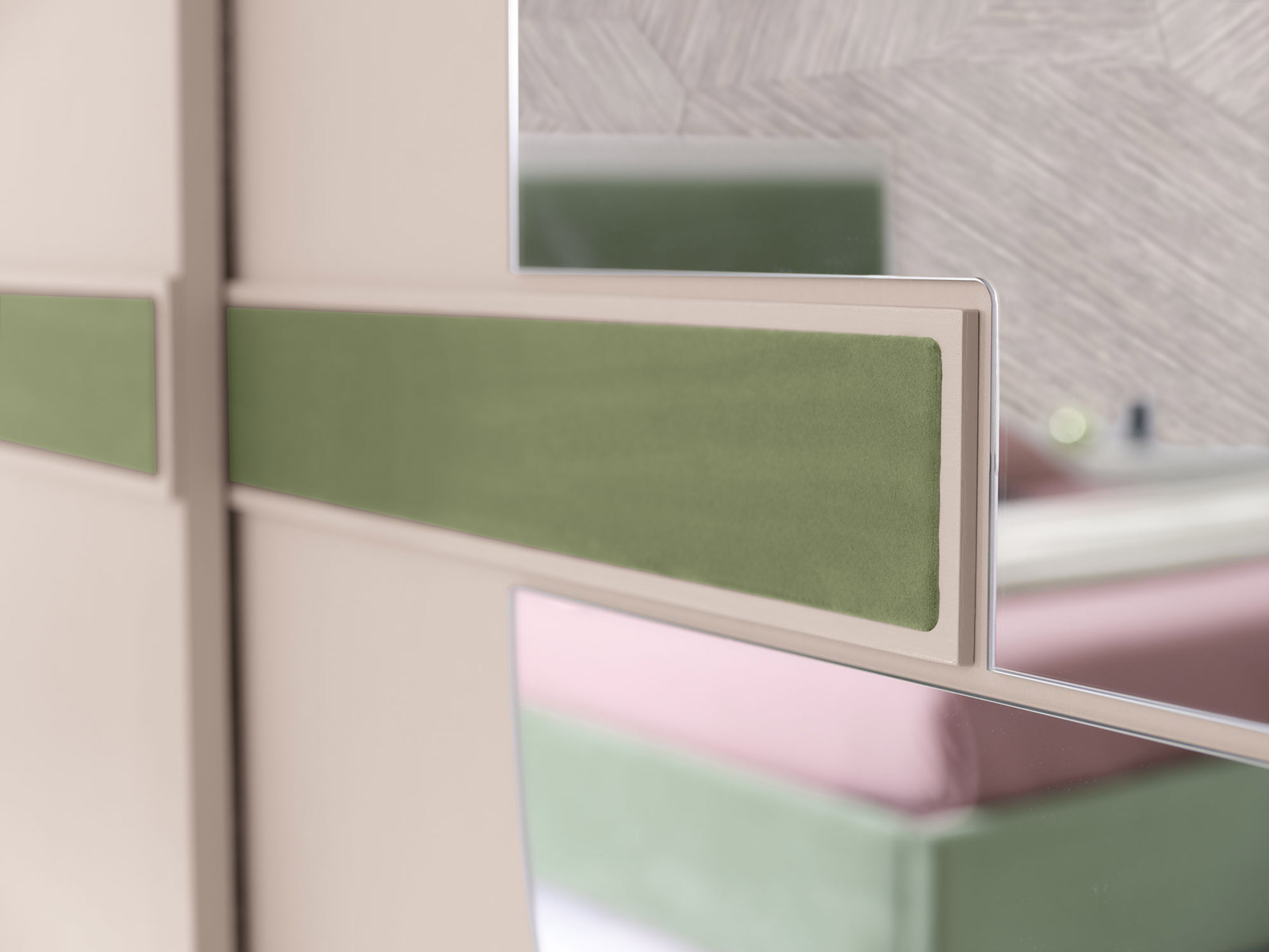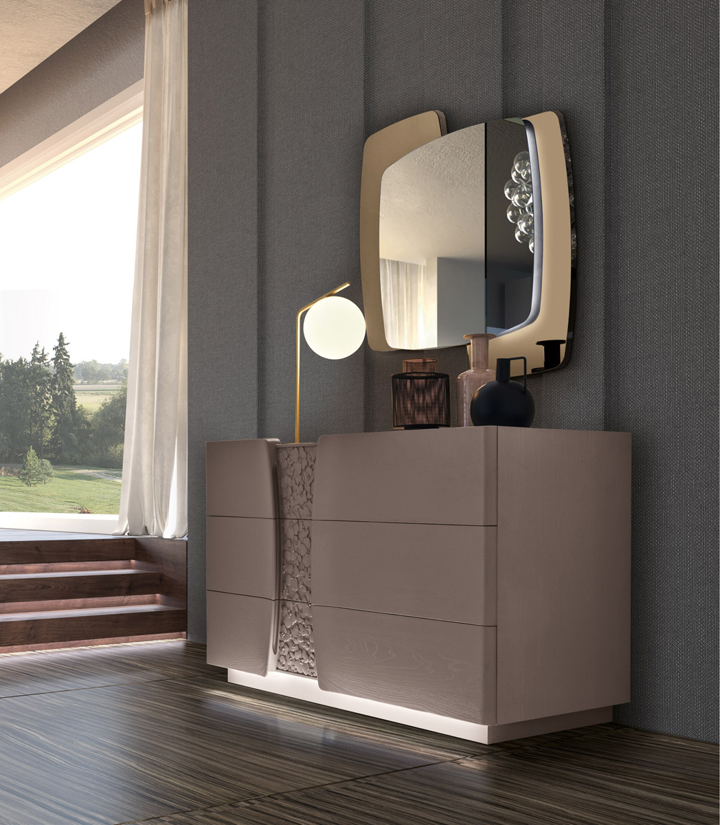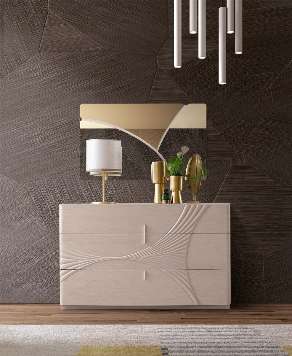 In FOLIS la geometria della foglia diventa pattern: una leggera trapuntatura sulla testata richiama il decoro scolpito di comò e comodini, mentre gli elementi modulari della testiera costruiscono una composizione dinamica con LED integrati alle estremità. L’armadio FOLIS con ante scorrevoli alterna specchi bronzo e chiari, aggiungendo profondità e movimento all’insieme. Risultato: una camera dal segno delicato, contemporaneo e altamente caratterizzante.