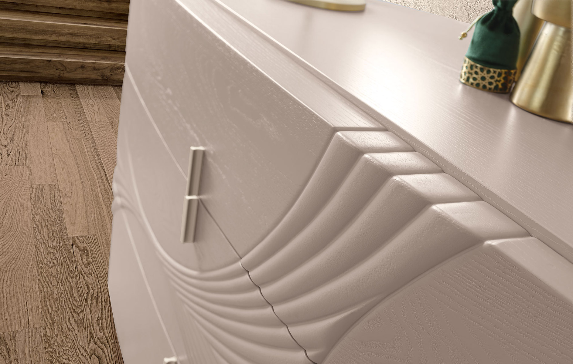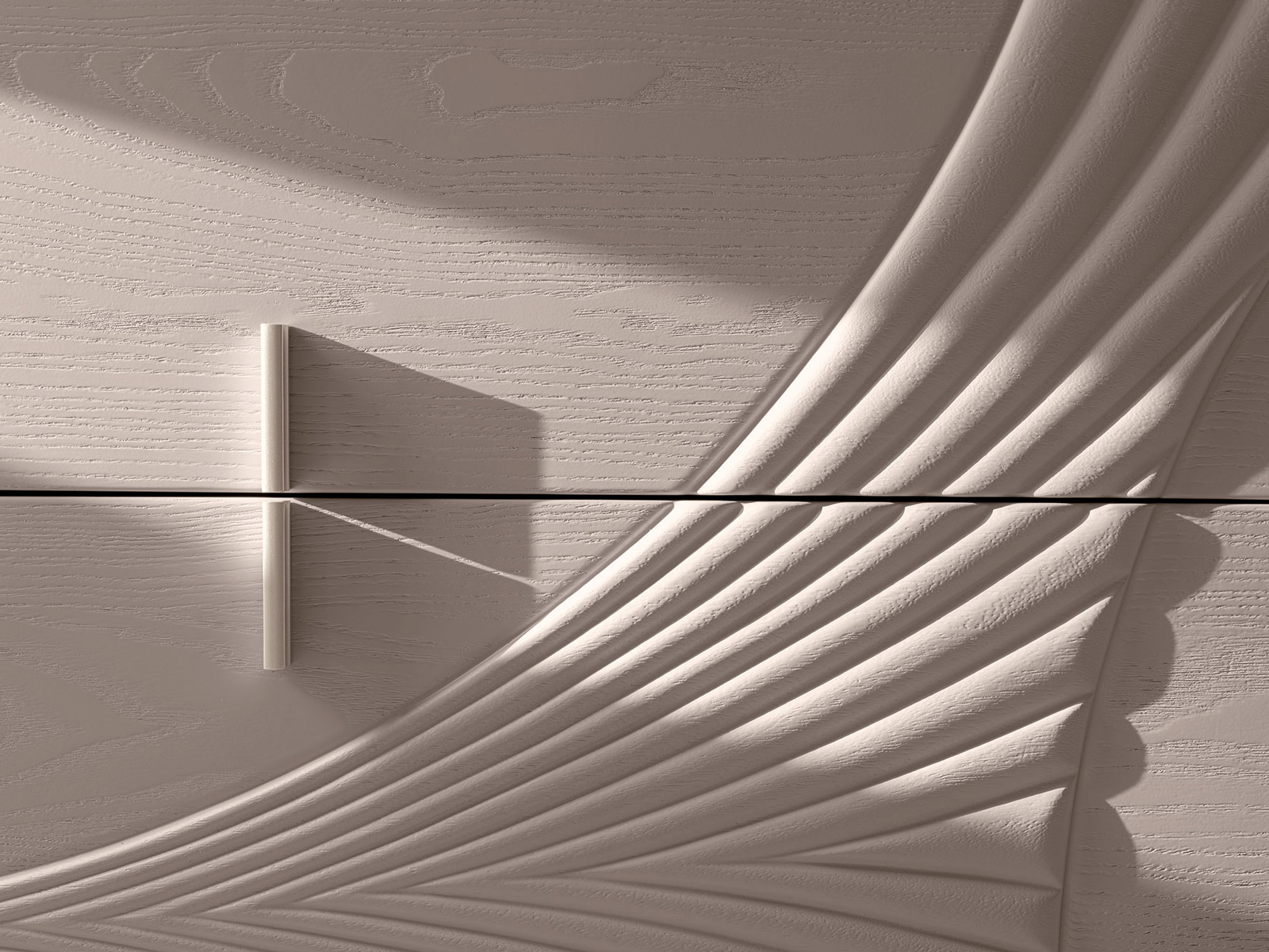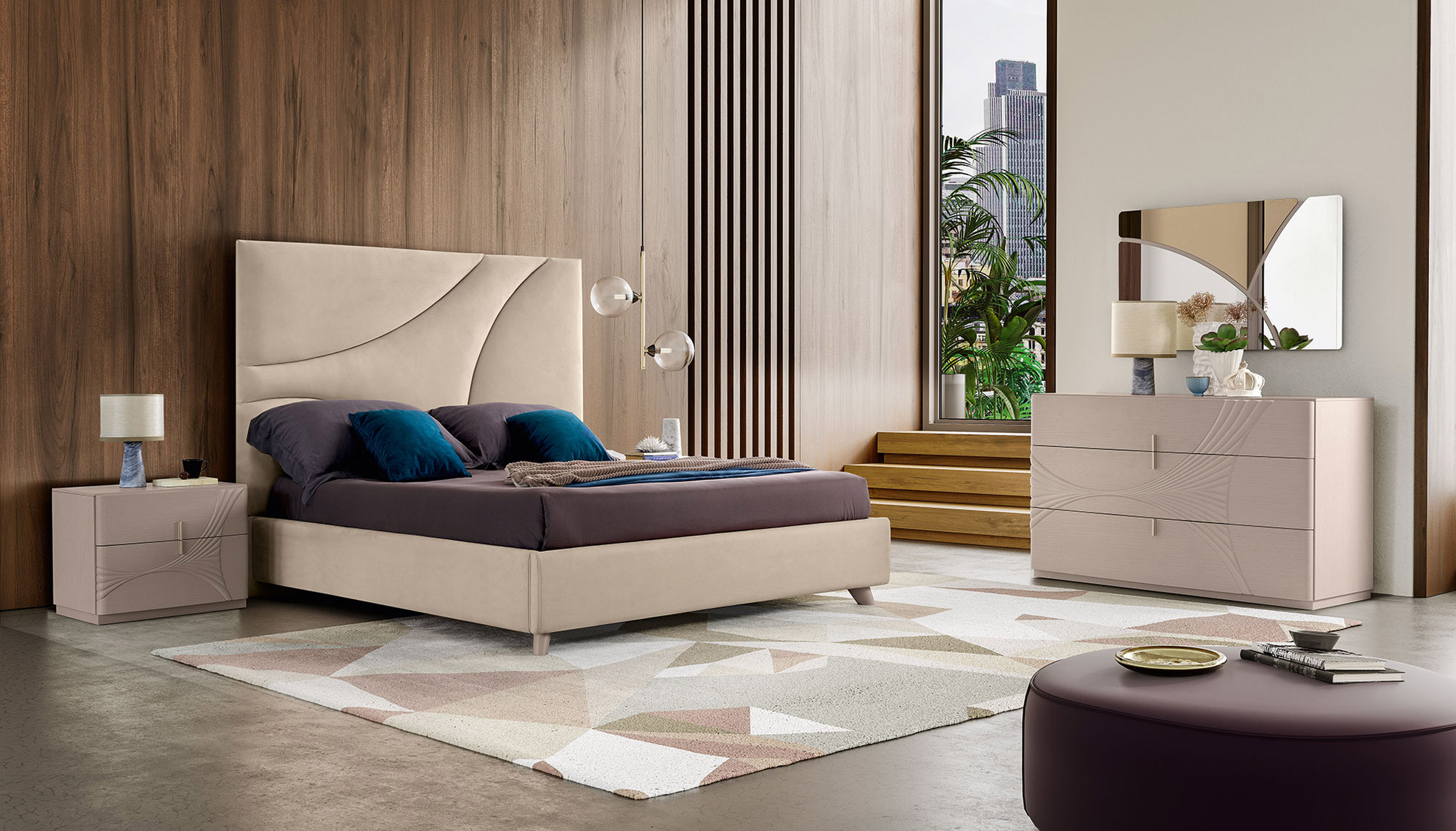 RIVER lavora su curve e contrasti morbidi: il motivo “a vortice” dei frontali di comodini e comò trova continuità nelle impunture della testata sagomata del letto MOON. Palette tessili attuali e volumi equilibrati costruiscono un’estetica armoniosa, ideale per ambienti metropolitani e residenze contemporanee.