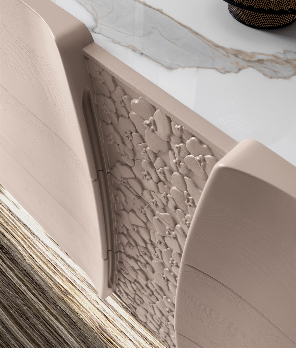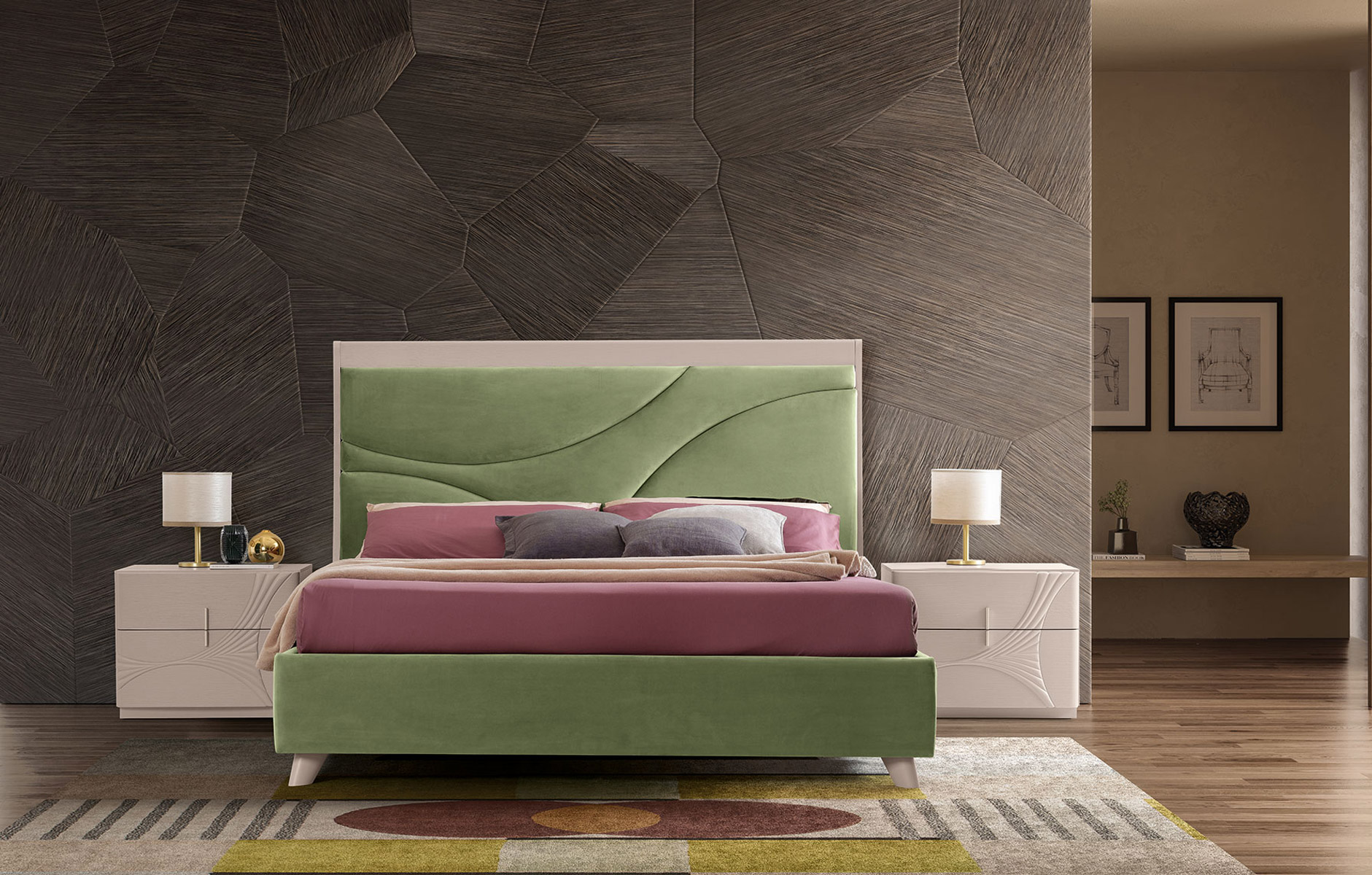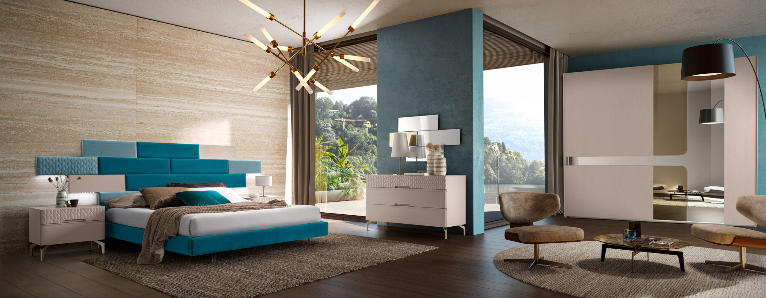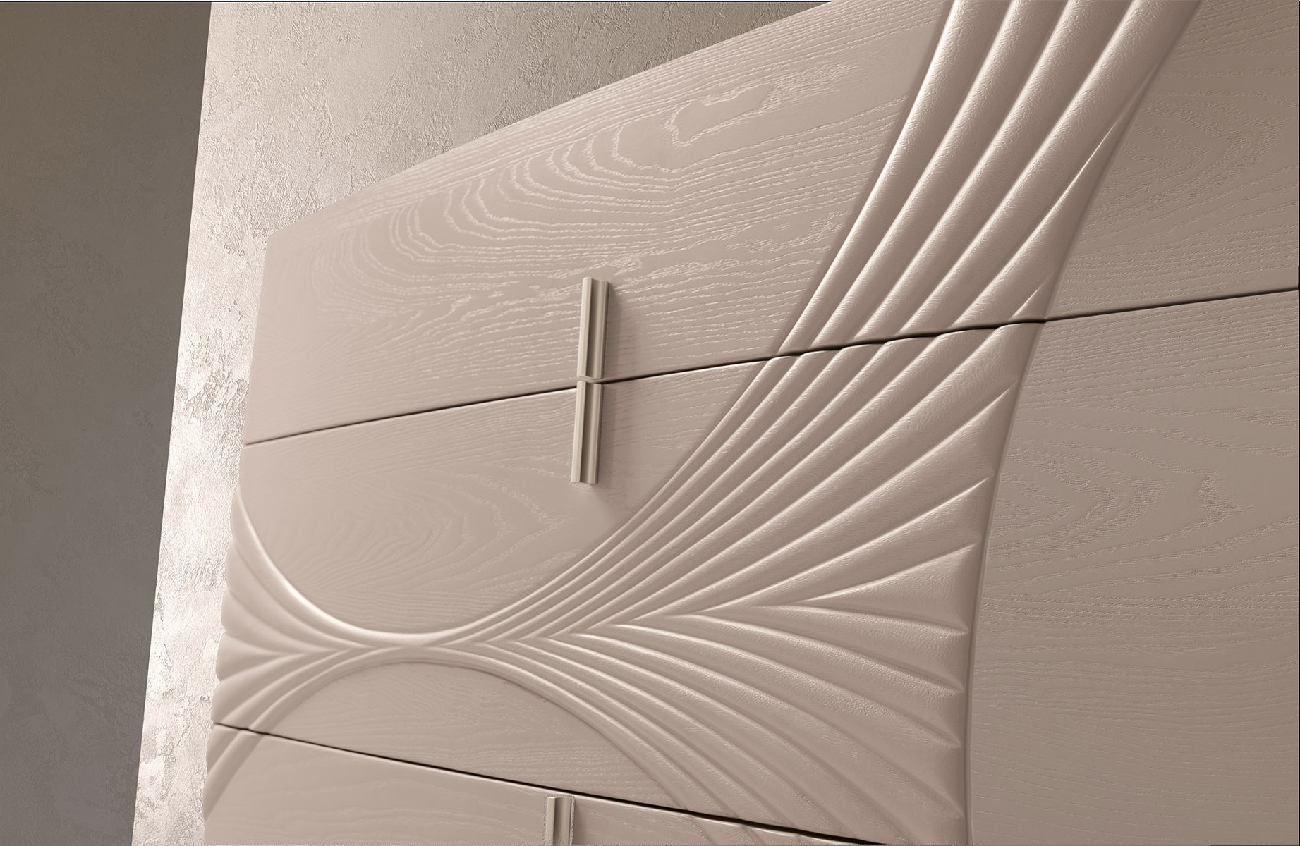 RIVER lavora su curve e contrasti morbidi: il motivo “a vortice” dei frontali di comodini e comò trova continuità nelle impunture della testata sagomata del letto MOON. Palette tessili attuali e volumi equilibrati costruiscono un’estetica armoniosa, ideale per ambienti metropolitani e residenze contemporanee.