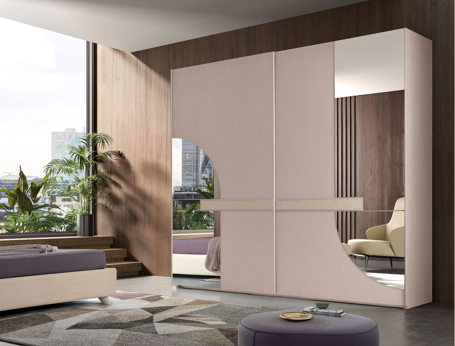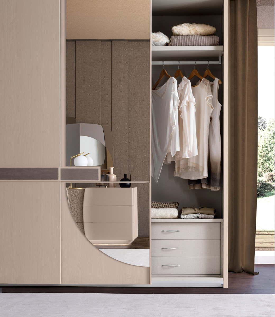 MATRIX è l’armadio scorrevole che amplifica lo spazio grazie agli specchi chiari e a un inserto centrale incorniciato, rivestibile con tutti i tessuti a campionario per abbinarsi al letto (oppure, su richiesta, in specchio bronzo). La struttura è completamente in tamburato con ante a chiusura assistita e ammortizzata; all’interno, dotazione completa: 2 ripiani, 3 tubi appendiabiti in alluminio personalizzati “RTL” e una cassettiera a 3 cassetti con guide ammortizzate. Un sistema tecnico ed estetico di alto profilo, progettato per durare.