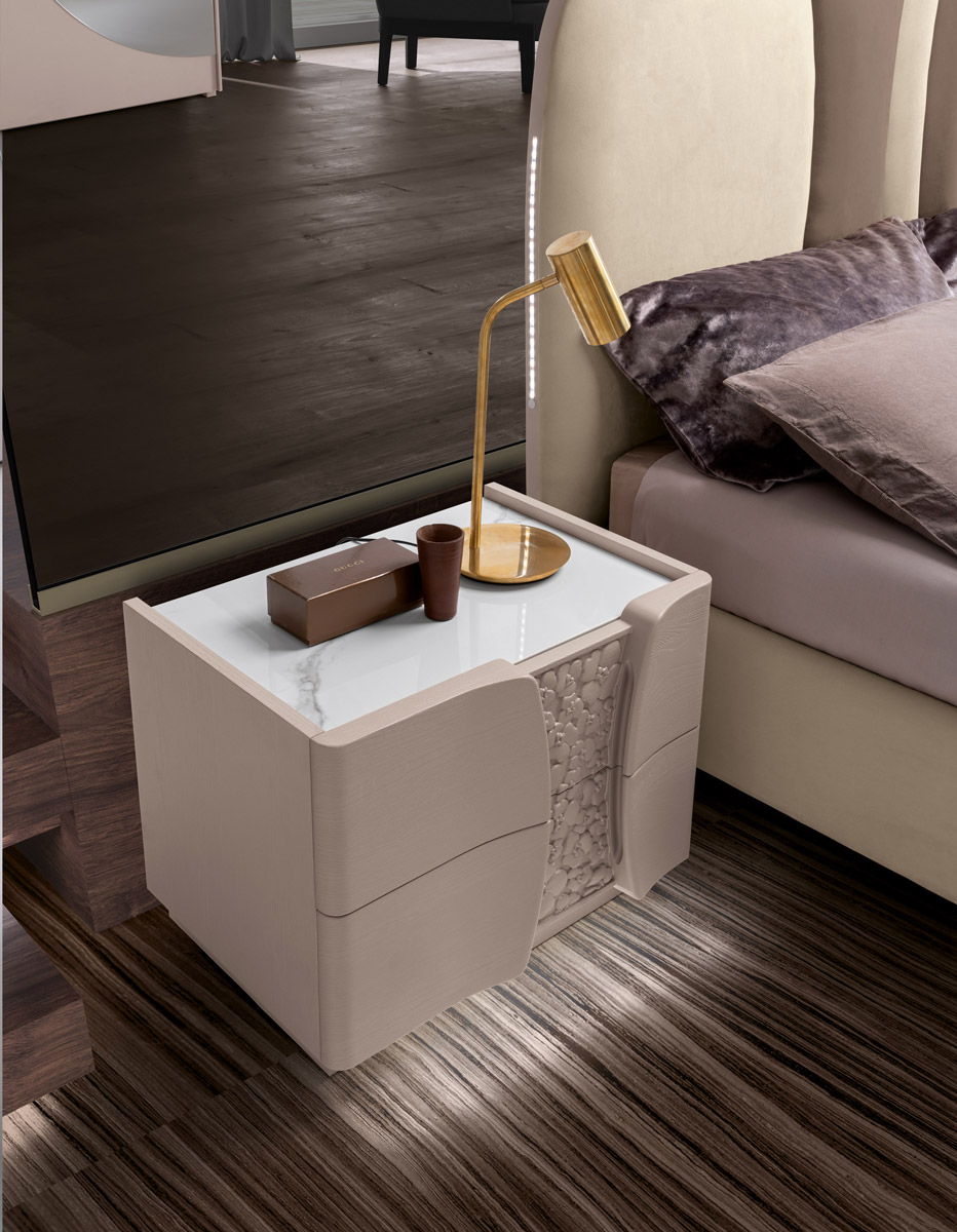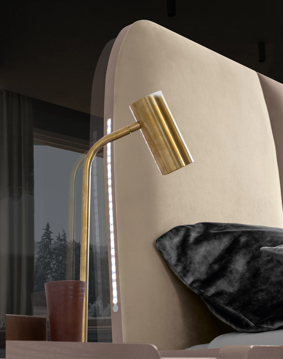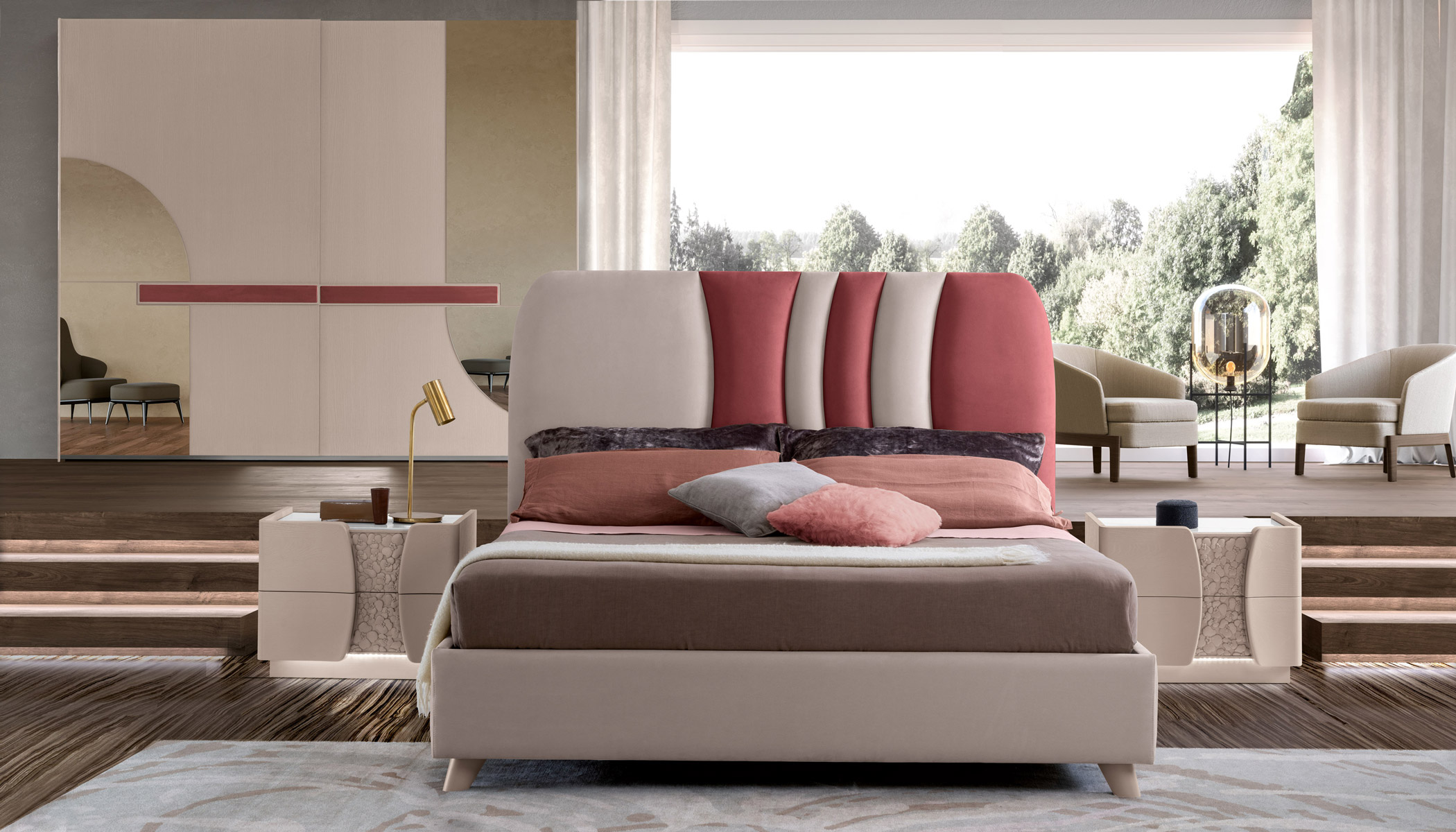 RUDIS interpreta la verticalità della natura con una testata imbottita dal ritmo cromatico calibrato; la luce diventa progetto grazie ai LED touch integrati sui fianchi della testiera (e, su richiesta, su comò e comodini con accensione a sensore). I gruppi presentano frontali scolpiti e piani a vassoio opzionali in gres porcellanato lucido Calacatta Michelangelo o in vetro temperato serigrafato, per un equilibrio tra tattilità, riflessi e ordine quotidiano. In abbinamento, l’armadio MATRIX riprende i toni del letto con inserto rivestibile negli stessi tessuti, per un ensemble raffinato e coordinato.