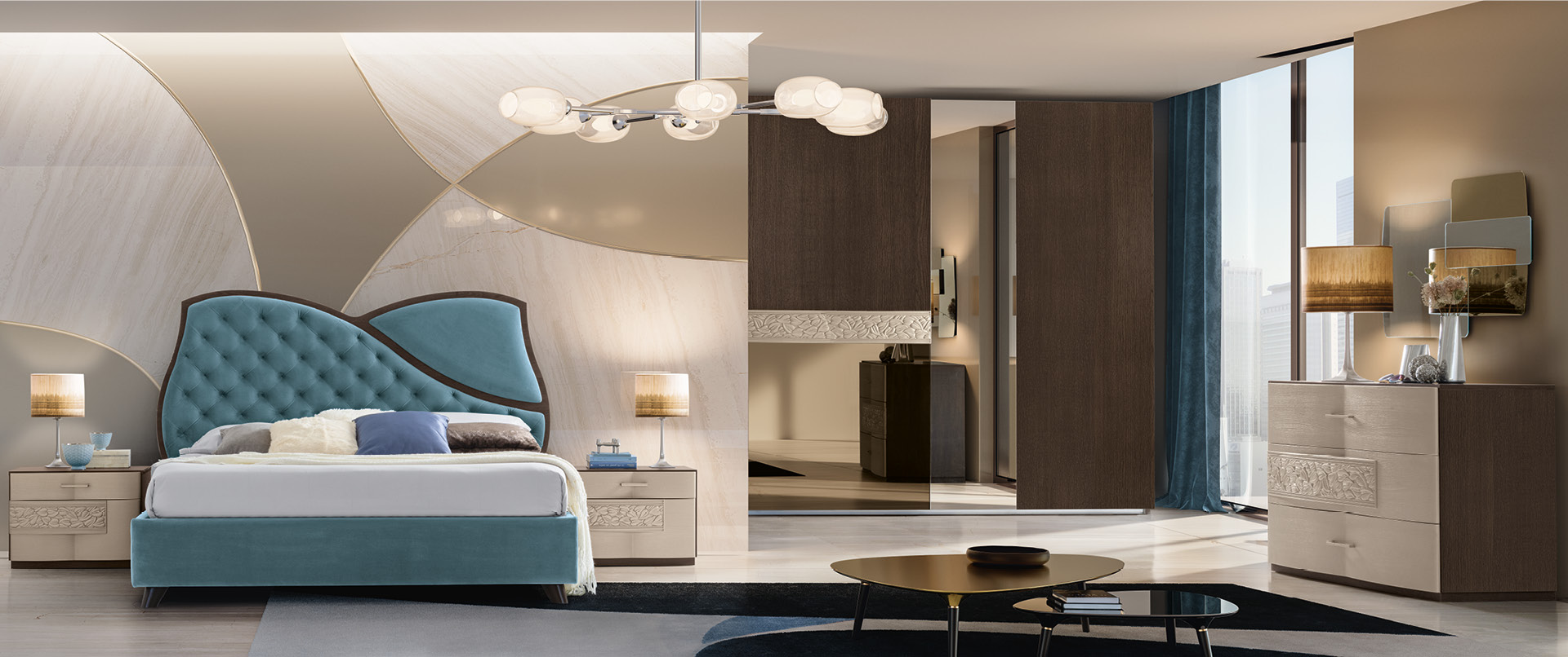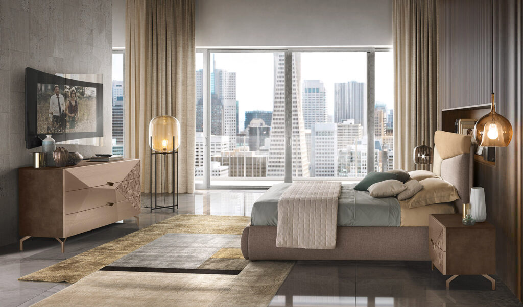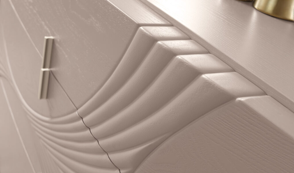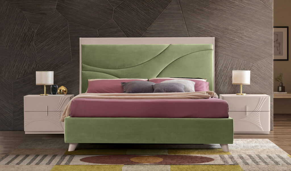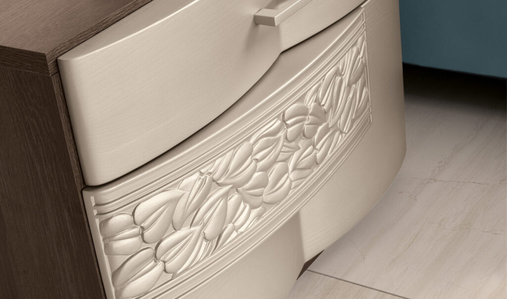 Il decoro scolpito nei frontali del comò e comodini si ritrova sotto forma di leggera trapuntatura anche sulla testata del letto FOLIS, creando un gioco armonico estremamente delicato e raffinato.