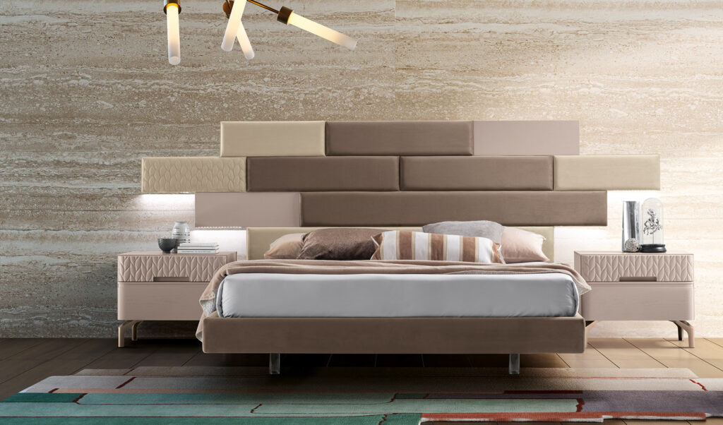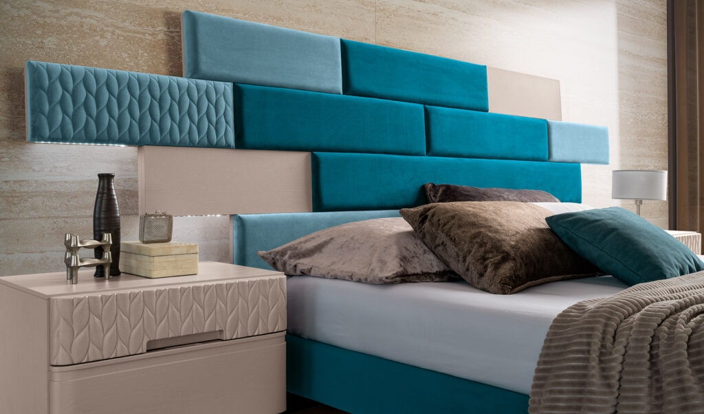 La testata del letto FOLIS è formata da elementi geometrici che creano una composizione dinamica e movimentata. Il dettaglio del pattern decorativo, presente anche sul frontale del comodino, insieme all’utilizzo di varie sfumature di colore danno tridimensionalità a tutto l’elemento. Sulle estremità laterali della testata sono inserite le luci LED per un effetto ancora più suggestivo.
