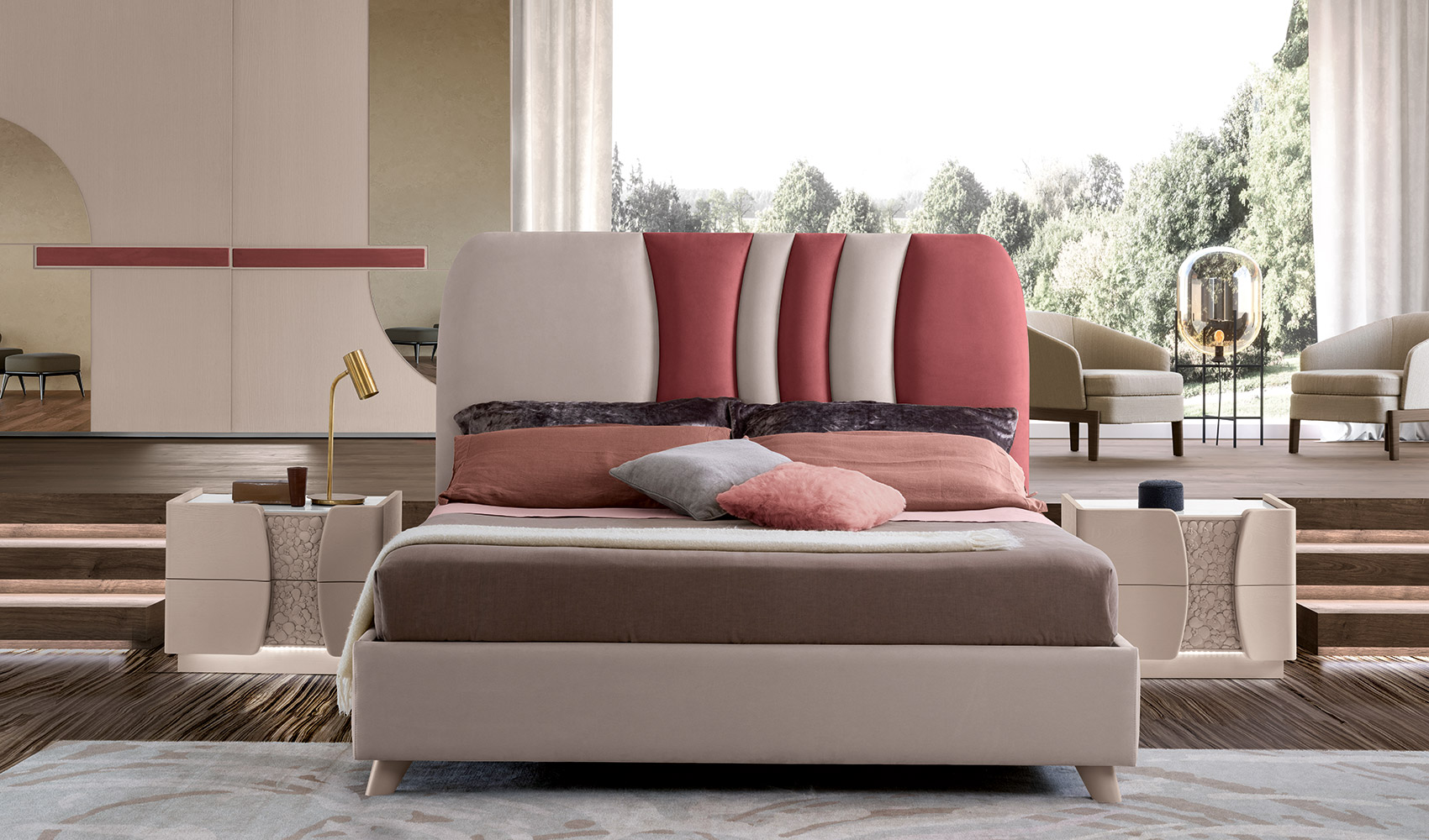 Il motivo decorativo dei comodini e del comò crea un vortice curvilineo in completa armonia con le impunture delle testate dei due letti presentati in queste pagine: il letto RIVER, con la sua testata sagomata con pannello imbottito centrale, ed il letto MOON, che presenta una testata più alta (h. 150) completamente imbottita.