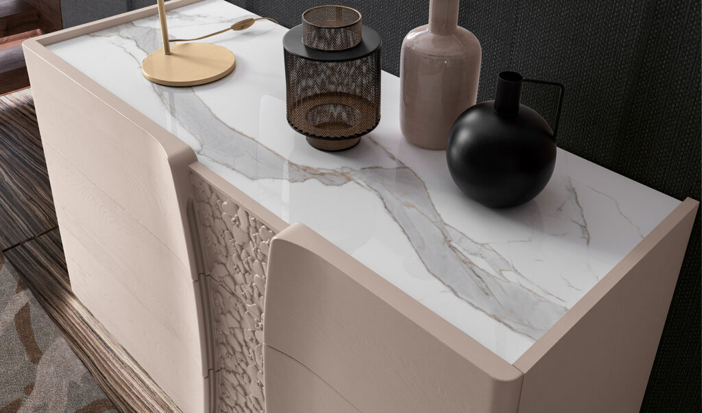 Particolare dall’alto del comò RUDIS con piano a vassoio. Possibilità di inserire in appoggio il gres porcellanato lucido Calacatta Michelangelo, qui fotografato, oppure a scelta anche un top in vetro temperato serigrafato.