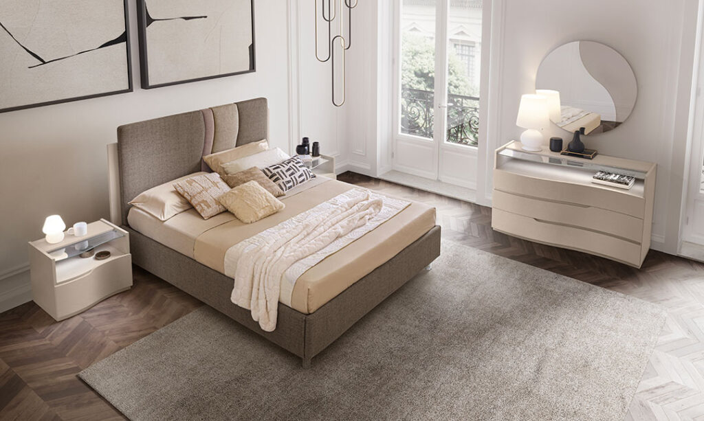 La zona notte si arricchisce ulteriormente grazie agli altri componenti del gruppo GIGLIO, come i comodini e il comò con finitura cachemire, che conferiscono una delicata ricercatezza e una sensazione di comfort e stile distintivo. La specchiera, impreziosita da luci LED, aggiunge un tocco di luminosità e modernità, completando l’atmosfera con un fascino contemporaneo e inconfondibile.