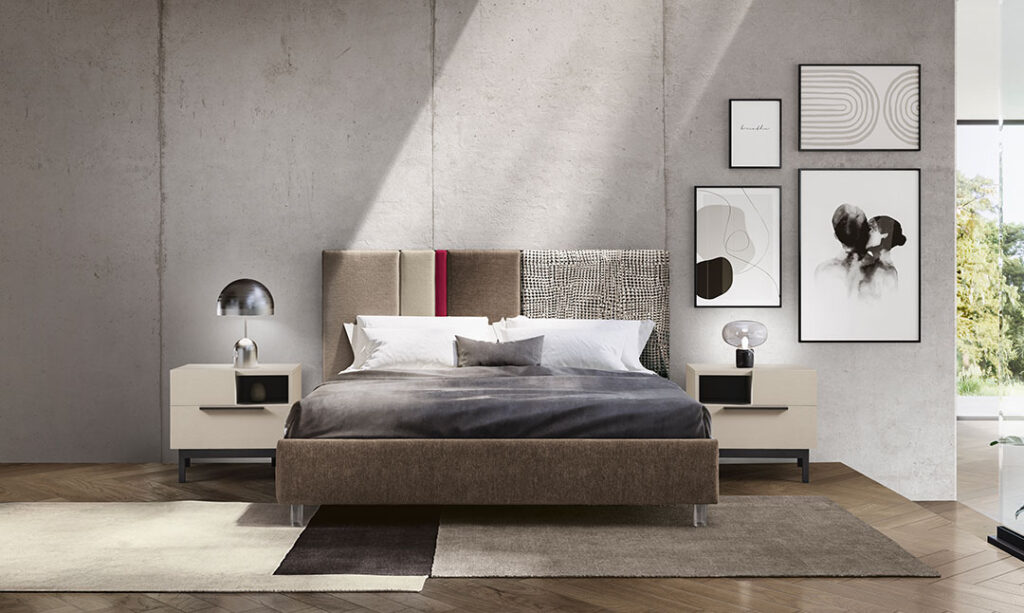 IN FOTO: Letto PANAREA (velluto DUB 16 – DUB 06 – DUB 33 – DUB 36 – RET T 0166 – giroletto DUB 16), comodini GIGLIO.