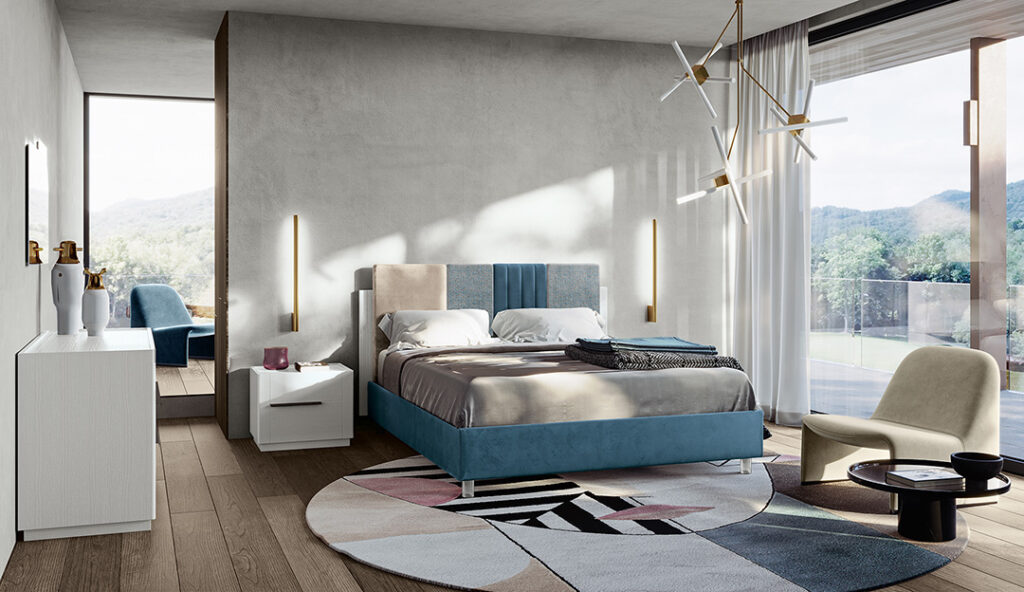 IN FOTO: Letto CAPRI (velluto BLUES 344 – LAN T99 – BLUES 373 – LAN T99 – giroletto BLUES 373),
