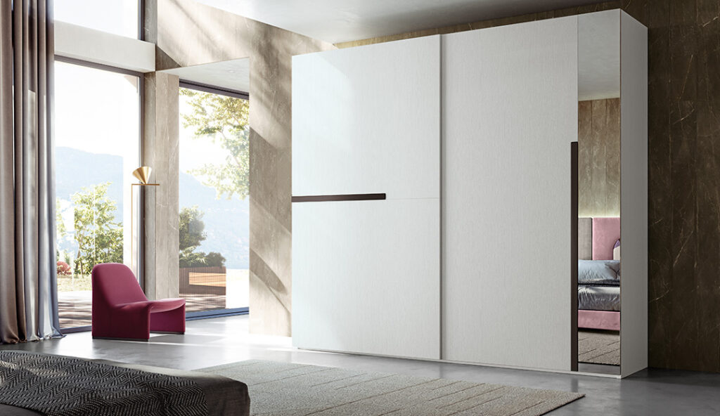 Lo specchio integrato nell’anta dell’armadio Orizzonte a ante scorrevoli può essere bronzo nella versione cachemire o chiaro nella versione bianca, ed è un elemento significativo che contribuisce a dare movimento e profondità a tutto l’insieme.